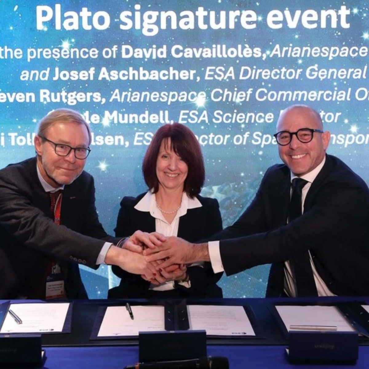 Am 29. Januar 2025 wurde der Startvertrag für die ESA-Mission PLATO unterzeichnet. Bei der feierlichen Unterzeichnung auf der Europäischen Raumfahrtkonferenz in Brüssel waren Carole Mundell, Direktorin für Wissenschaft der Europäischen Weltraumorganisation (ESA), sowie ESA-Weltraumtransportdirektor Toni Tolker-Nielsen und Steven Rutgers, Chief Commercial Officer von Arianespace, anwesend.