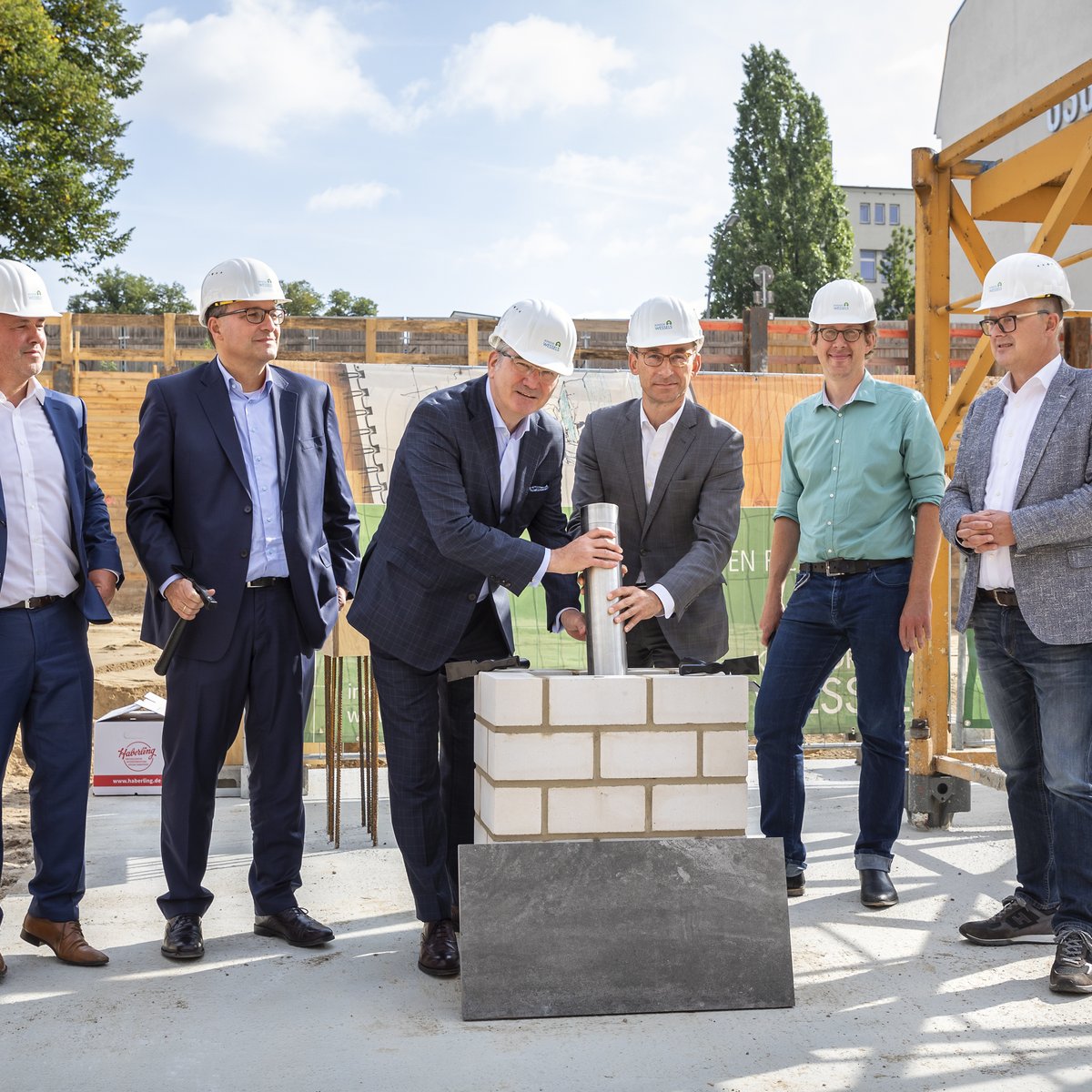 Die Grundsteinlegung war Kondor Wessels erste Veranstaltung mit externen Gästen seit dies durch die Lockerung der Corona-Maßnahmen wieder möglich ist. Dank eines Hygienekonzepts konnten auch die geladenen Gäste bei der Verlegung des Grundsteins zusehen und den Reden von Kondor Wessels Bouw Berlin-Geschäftsführer Marcus Becker, Bezirksstadtrat Jochen Biedermann, Thilo von Stechow (Deutsche Asset One) und Christoph Beck (degewo) lauschen. Bei der Rückkehr von öffentlichen Grundsteinlegungen von Kondor Wessels durften die Vertreter der Projektpartner gemeinsam die Zeitkapsel in den Grundstein einlassen.